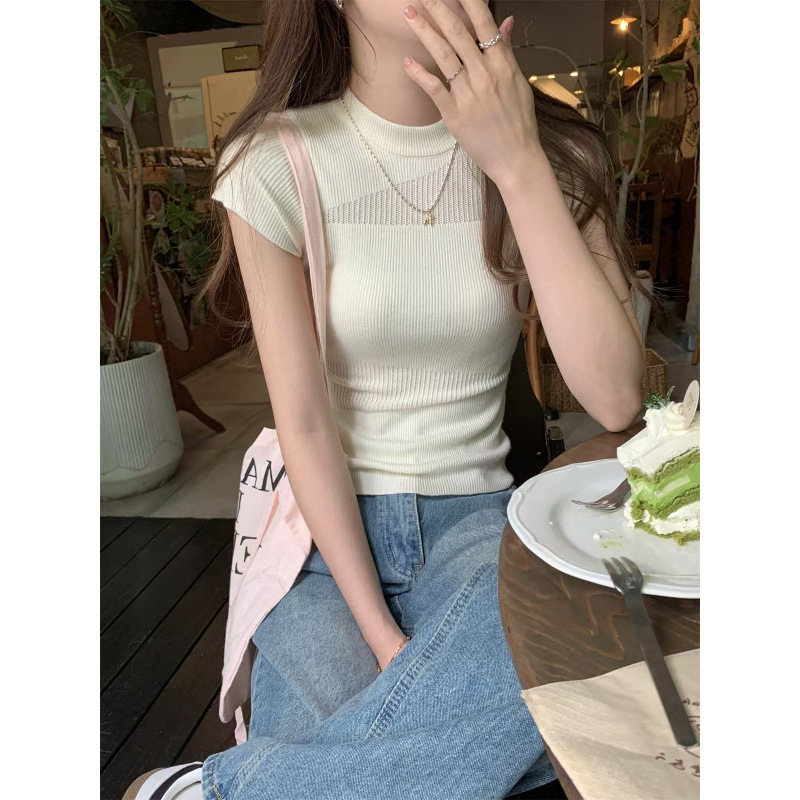 ホワイトハーフタートルネック半袖Tシャツレディース2025年夏ニット半袖新作中空デザインスリムフィットトップ