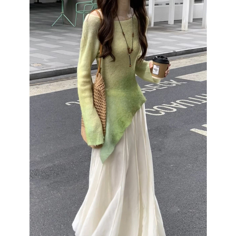 緑のグラデーション色のスリムなラッパ袖の長袖のシャツの春の服の女性の金の年の新型のドーパミンは上着を着ます。