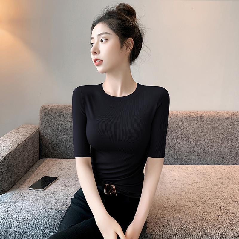 女性用ブラックミッドスリーブTシャツ2025新しい夏ニット薄手Tシャツボトムスとタイトな七分袖トップ
