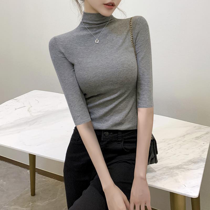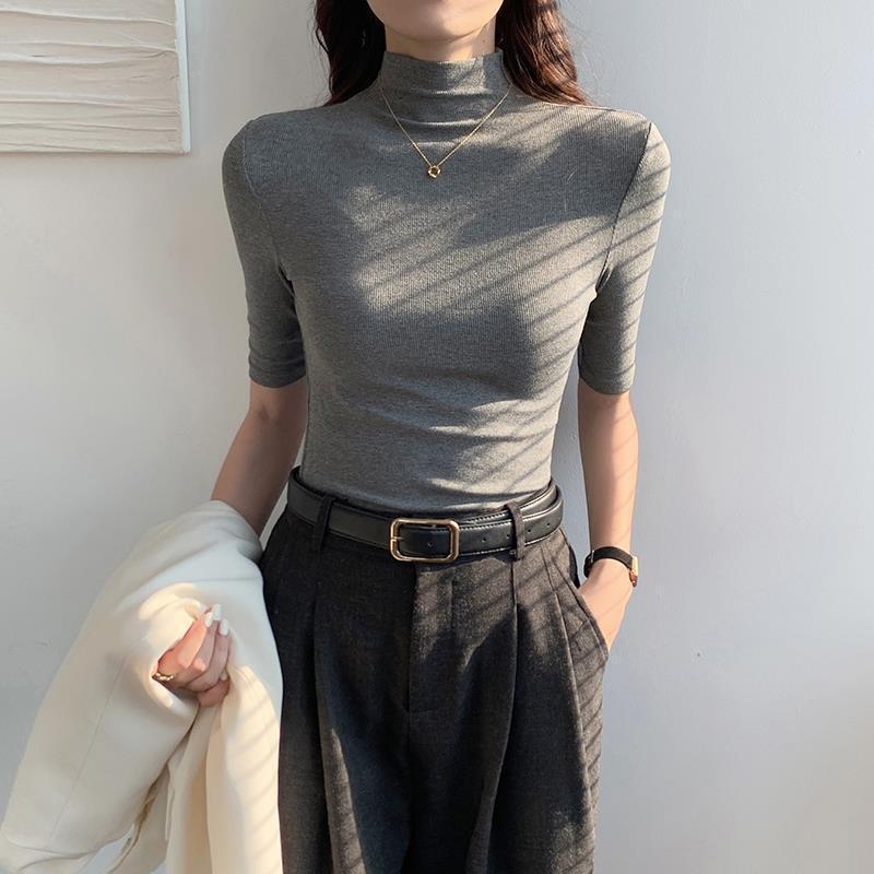 グレーニットミッドスリーブハーフタートルネックボトリングシャツTシャツレディース2025春秋新作5分袖スリムフィットトップ