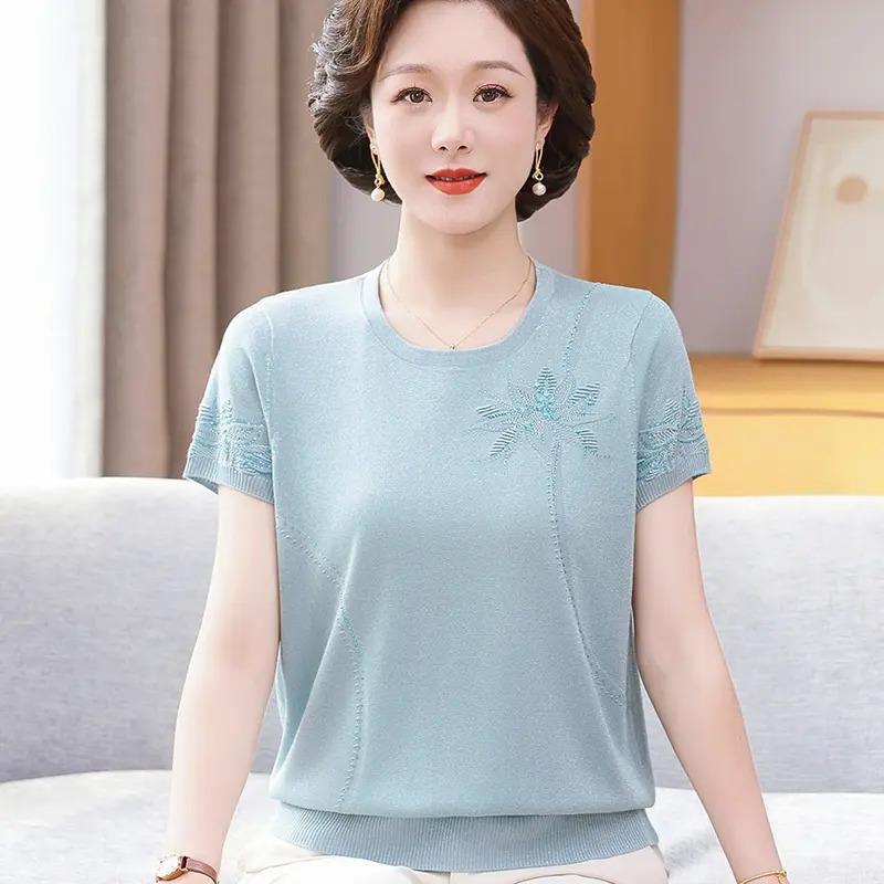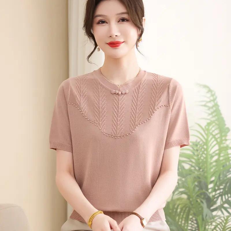 ママの夏服新しい中国風半袖セーター中高年夏のファッション無地ジャカード薄手Tシャツ