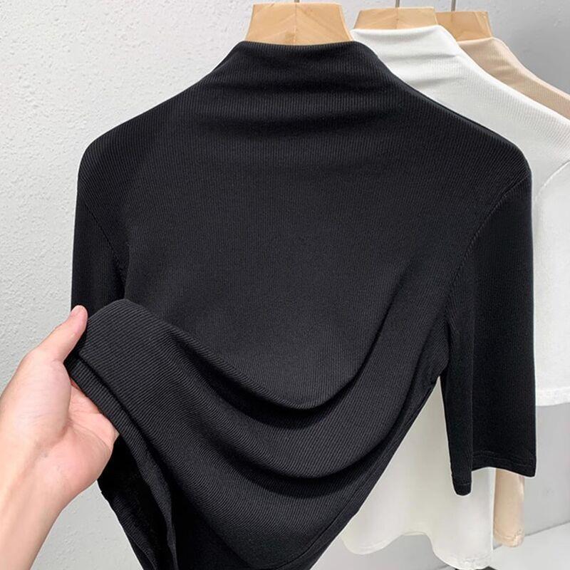 女性のための黒の小さなハーフタートルネックミッドスリーブTシャツ2025新しい春、夏、秋のタイトフィット5点ハーフスリーブニットボトムストップ