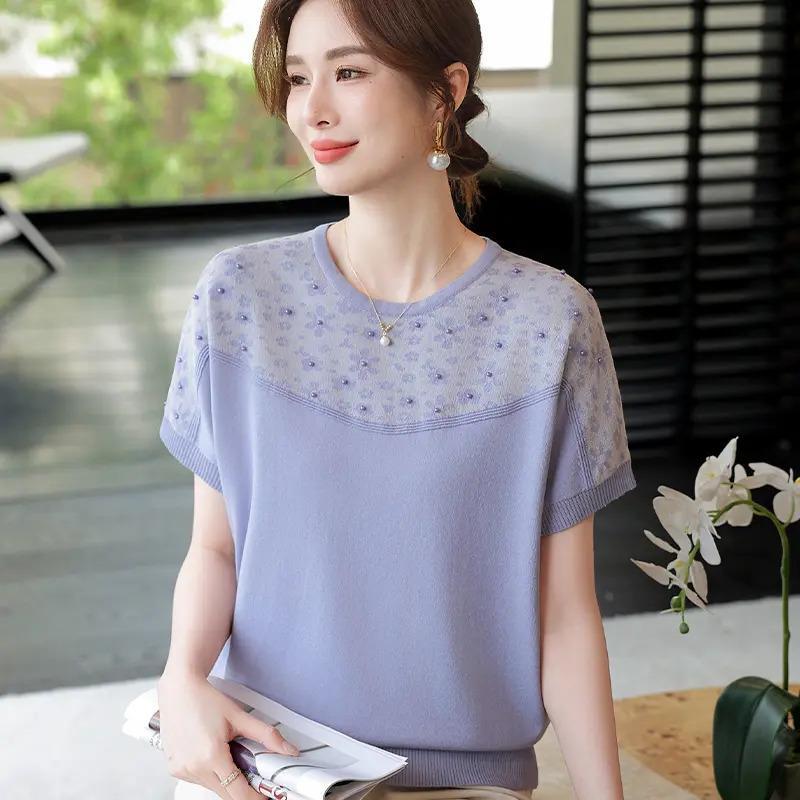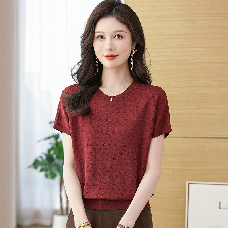 ママの夏服、おしゃれな中高年向け中空無地半袖セーター、夏スタイル、年齢軽減カジュアル万能トップス