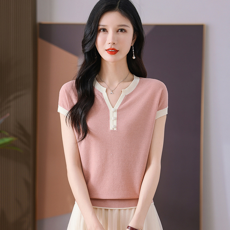 Vネックtシャツのショートタイプの小さい背の変わった洋風の小さいシャツ2025新型の夏の薄いタイプの天糸のニットの上着の女性