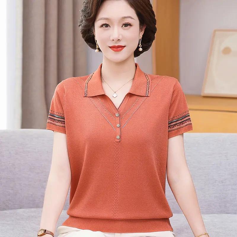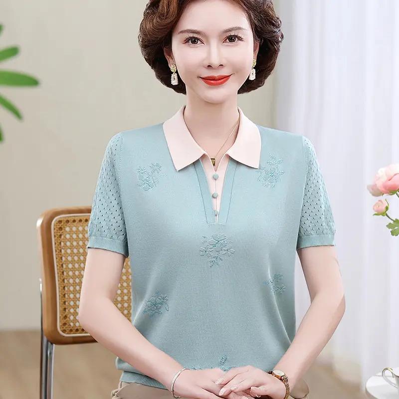 ママの夏スタイルラペル半袖セーター中高年夏カジュアルファッション万能カラーブロック薄手トップス