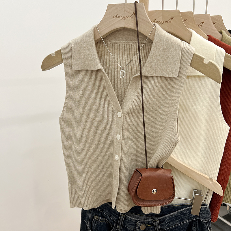 ラペル薄型スリムフィットサスペンダーアウターベスト女性の夏のシックなアイスシルクニットチョッキノースリーブトップ