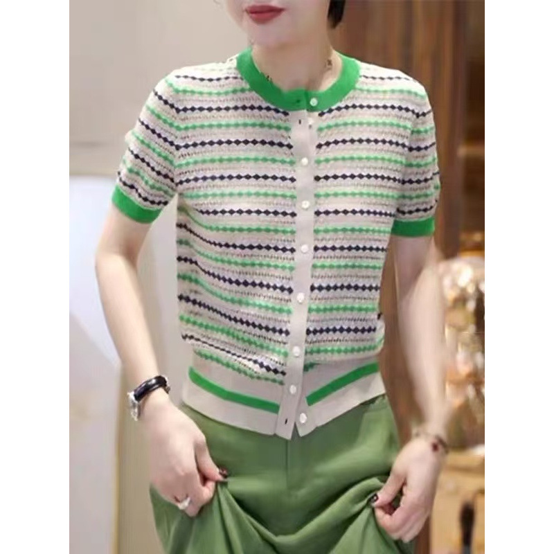 2025春夏の新型氷糸ニット半袖tシャツ女性ファッションピット格子洋気母ゆるい上着