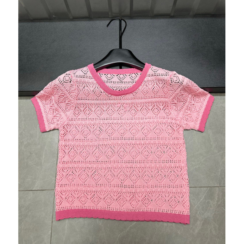 2025年夏新作フレグランス中空コントラストカラー半袖ラウンドネックプルオーバーゆったり万能レディースニットトップス