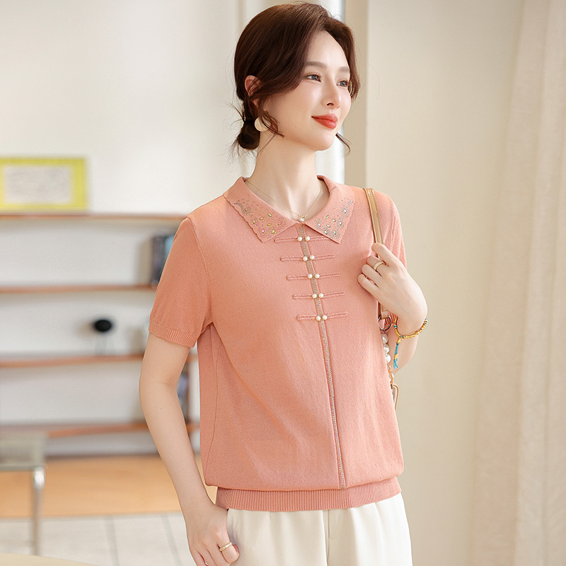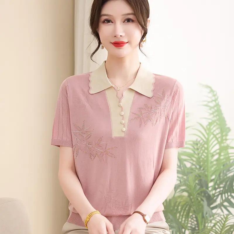 中高年向けの夏らしいラペル半袖ニットシャツ、お母さんの夏服、おしゃれな年齢軽減ホットダイヤモンド配色Tシャツ