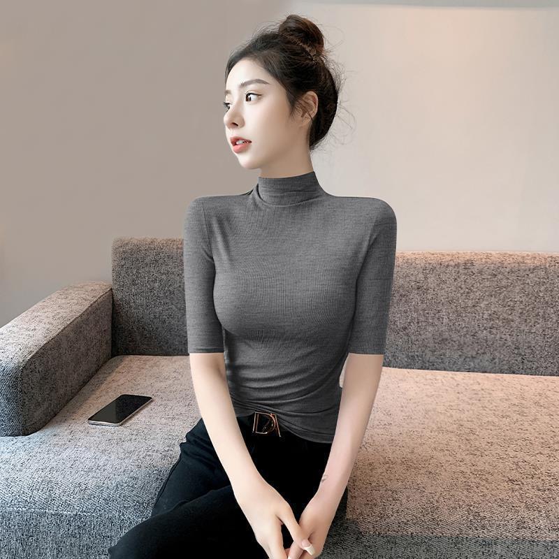 女性用ハーフタートルネックミッドスリーブボトリングシャツ2025春秋新作薄手ニットTシャツスリムフィット五分袖トップ