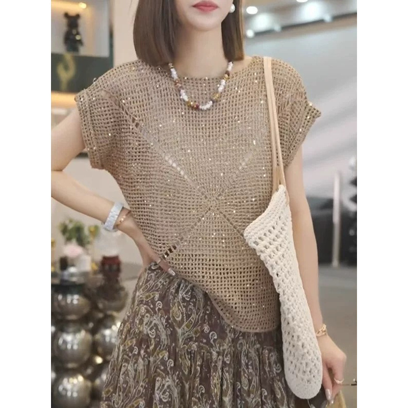 スパンコール中空ニット半袖シャツ女性のための 2025 夏の新しいルーズで怠惰な気質多用途ラウンドネックトップ