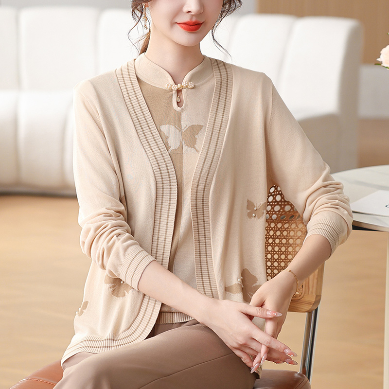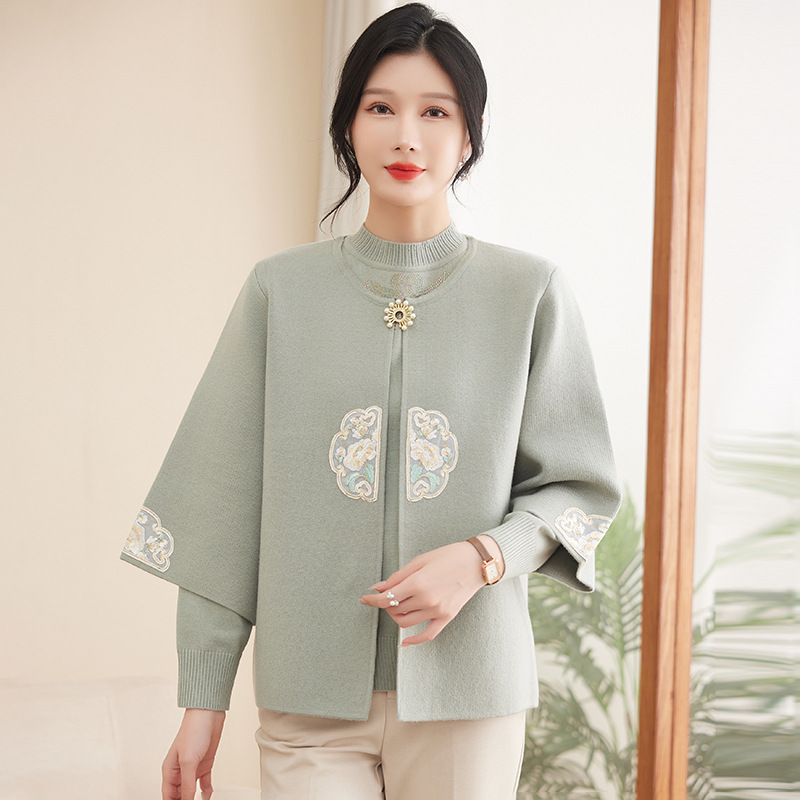 中年のお母さんの春の服のニットの服の2つのセットの新型の中国風のファッションは年齢を減らします中高年の婦人服の秋のコートを減らします。