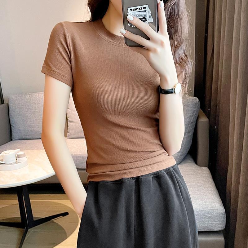 女性のための茶色の半袖 T シャツ 2025 春夏の新しいスタイルのハーフタートルネックニットボトムタイトで多用途な薄いトップ