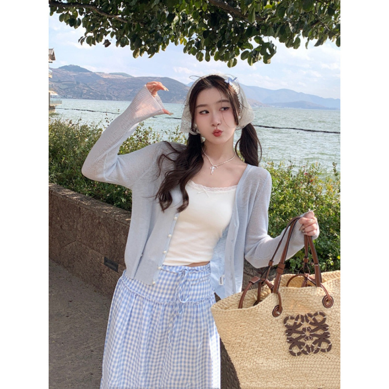 日焼け止めカーディガンの新型氷糸とストラップの上着のブラウスの青いコート