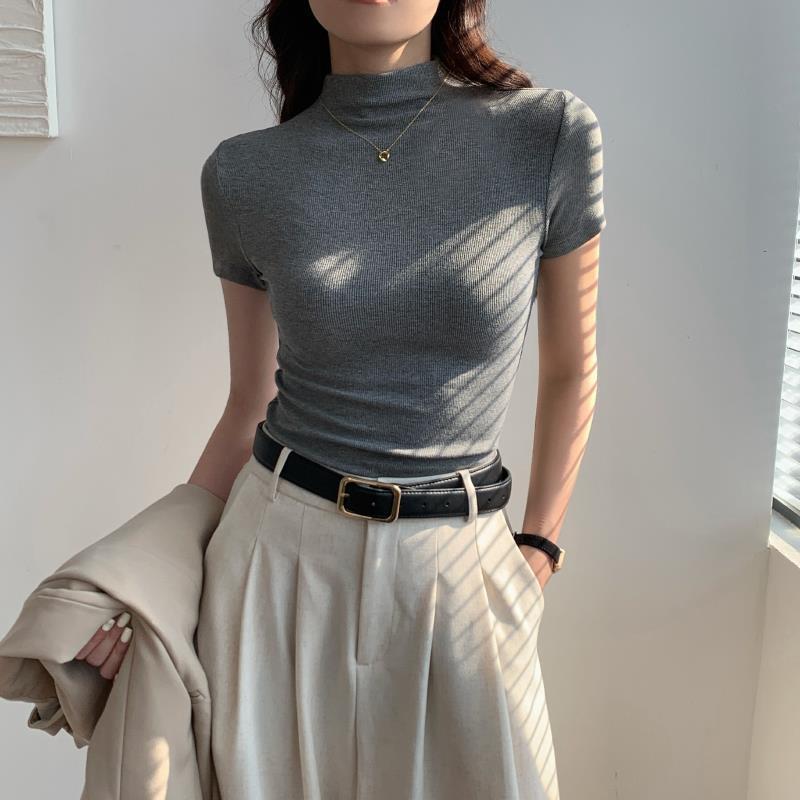 スモークグレーハーフタートルネック半袖Tシャツレディース2024春夏新作スリムフィットハイエンドニットミッドカラータイトトップ