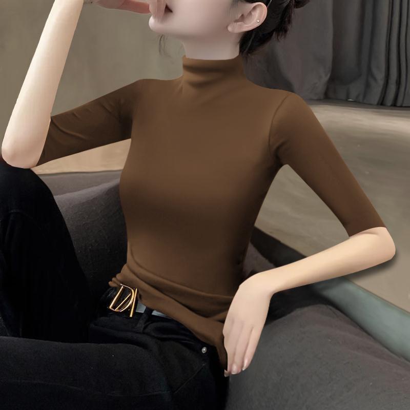 2025 新しい初秋コーヒー色のハーフタートルネックミッドスリーブデザインスリムボトムシャツニットインナーシンクトップ女性用
