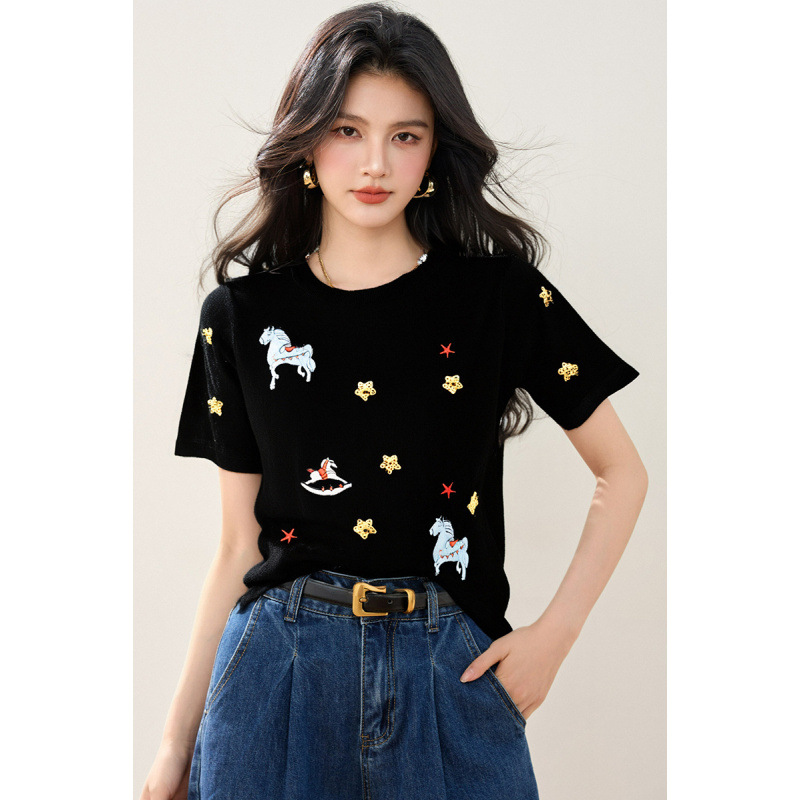 黒のトップ夏ルーズ漫画刺繍半袖女性の 2025 新しいニットウェア