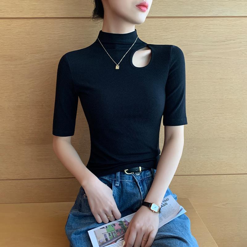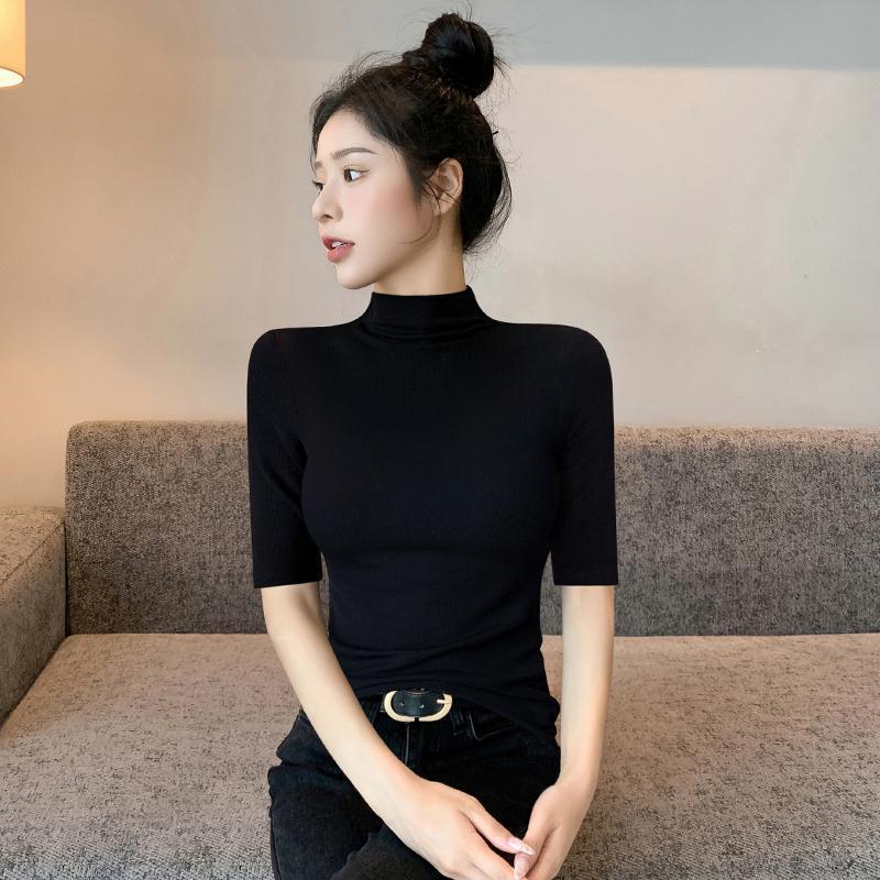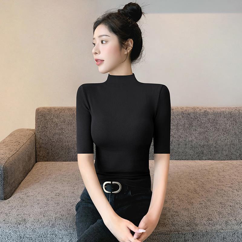 女性のための黒のハーフタートルネックミッドスリーブTシャツ205新しい夏のアウターニット右肩五分袖スリムトップボトム