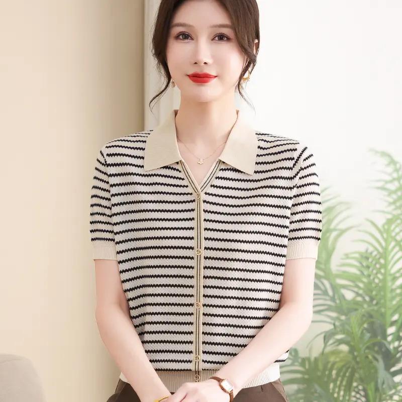 おしゃれなママの夏ラペルTシャツ、ゆったりニットアイスシルクシャツ、中高年女性の夏新作薄手トップス
