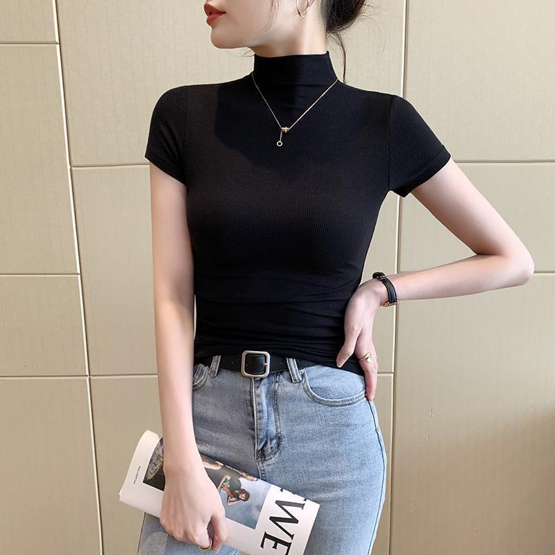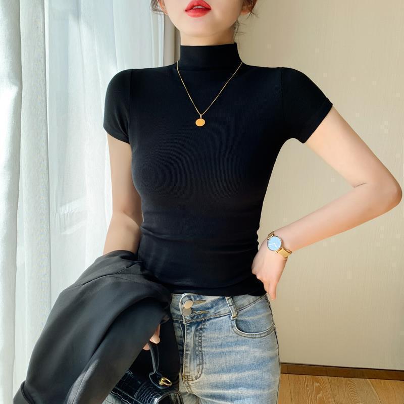 女性用ハーフタートルネック半袖Tシャツ2024春夏万能半袖ボトムシャツブラックニットタイトトップ