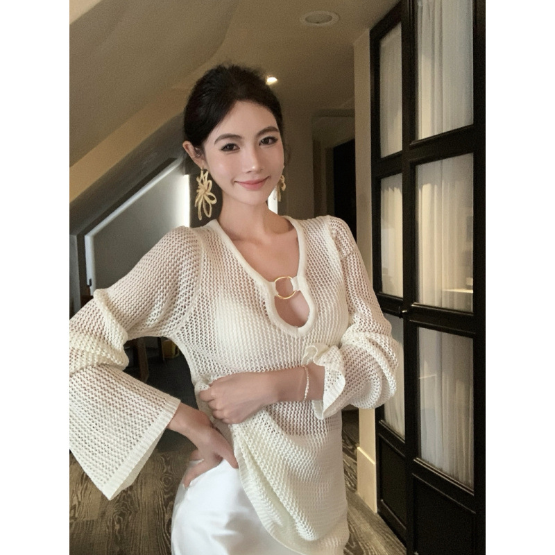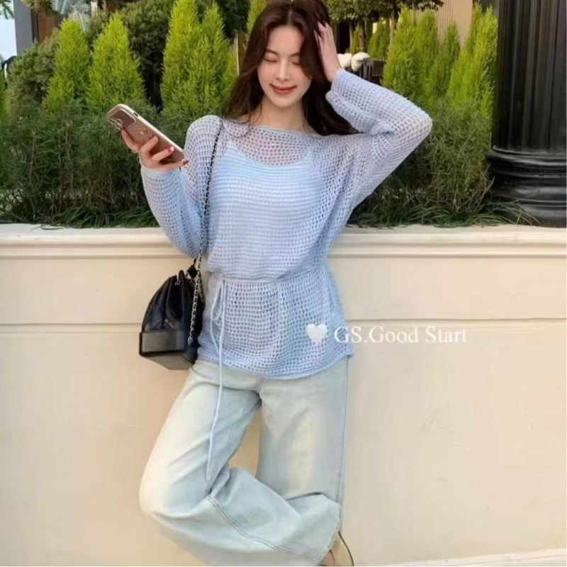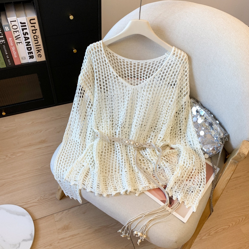 クロスボーダー初春と夏のボヘミアンリゾートスタイルの中空ニット日焼け止めブラウストップス、ロープ付き