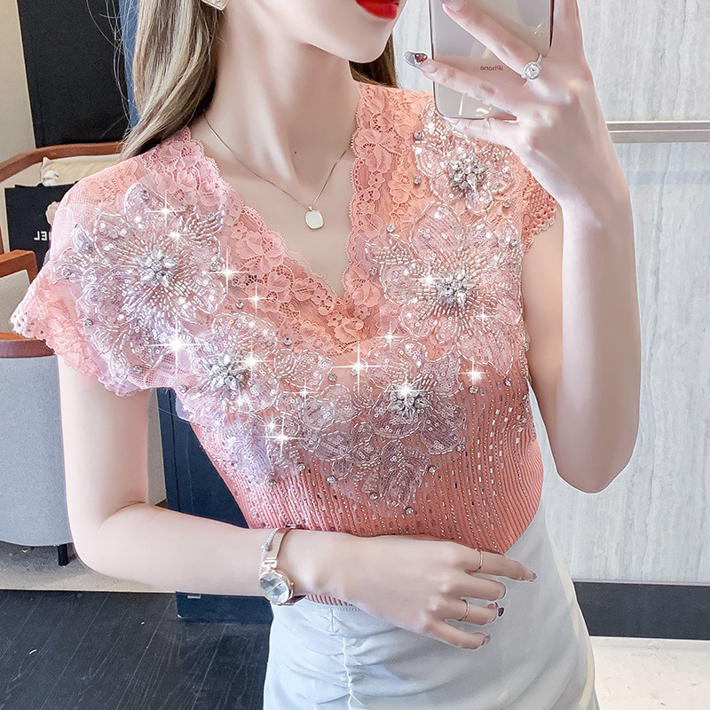 花の刺繍が施された黒のメッシュダイヤモンド半袖トップは、ファッショナブルでエレガントな夏のホットな新しいスタイルの選択です