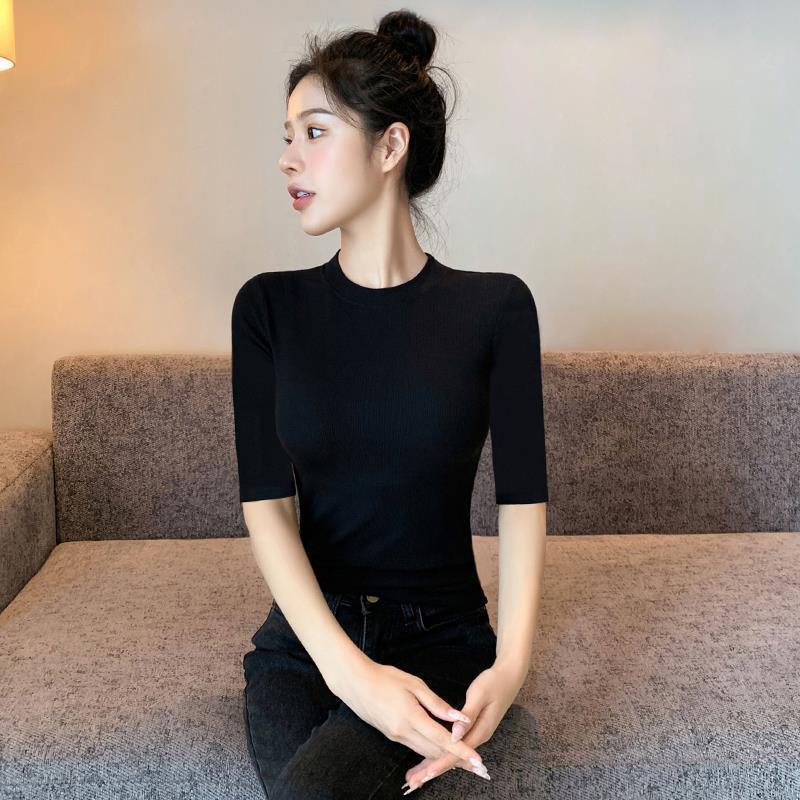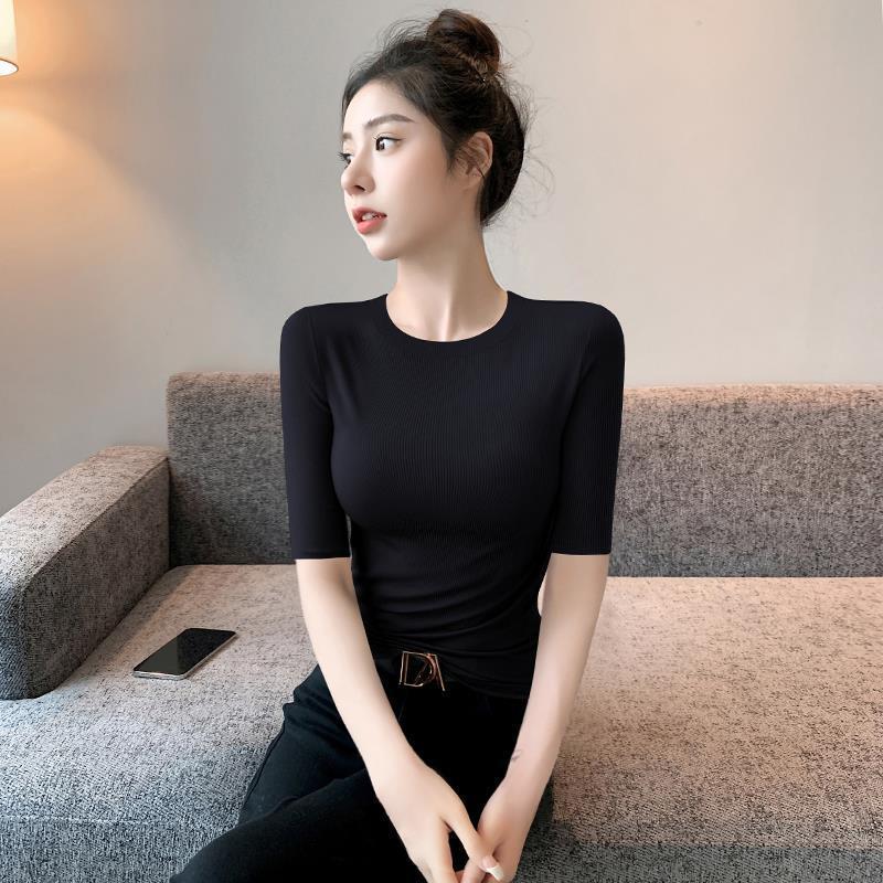 女性のための黒のミッドスリーブ Tシャツ 2025 新しい夏の薄いニット五分袖インナー Tシャツボトムストレッチトップ