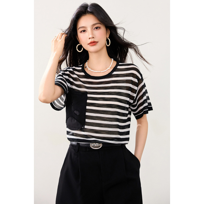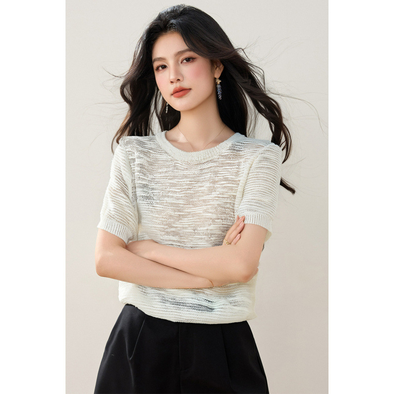 2025年夏のアイスニットの上着の薄いタイプの薄い透き通ったゆったりしたtシャツの女性