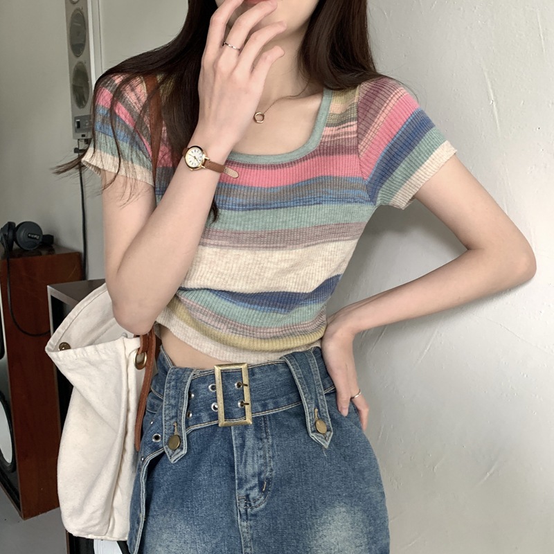 春夏韓国版ピュアディザイアスクエアネック右肩コントラストストライプニット半袖レディーストップ