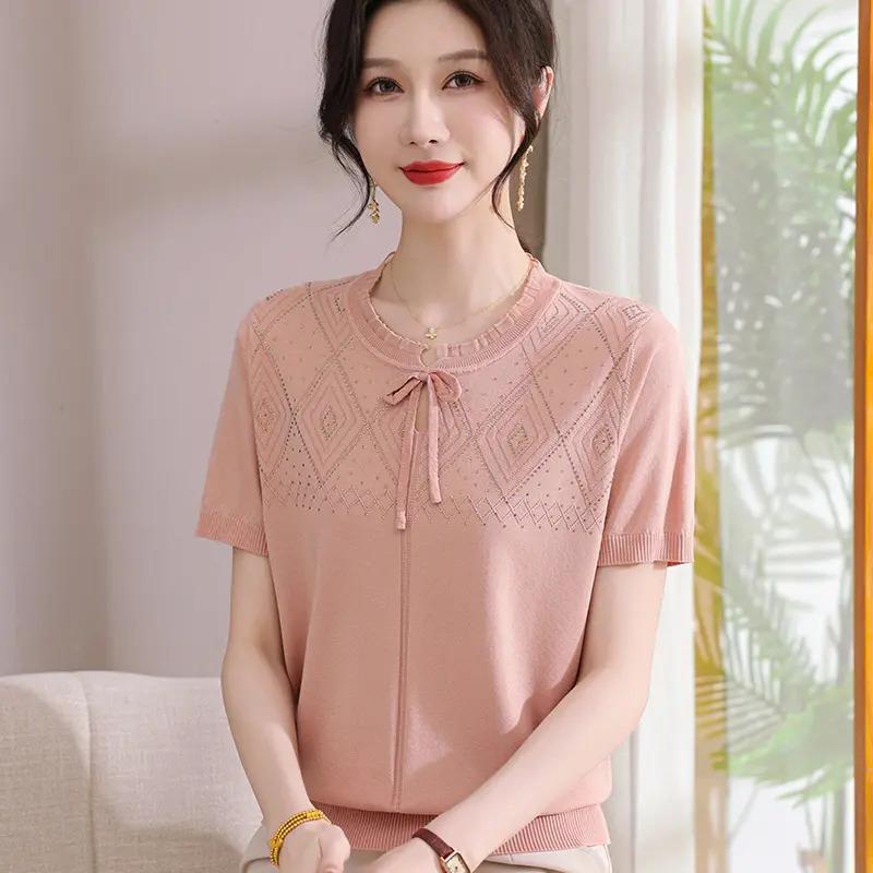 夏の新しい女性用半袖セーター、ラウンドネック、甘いリボンの薄いトップ