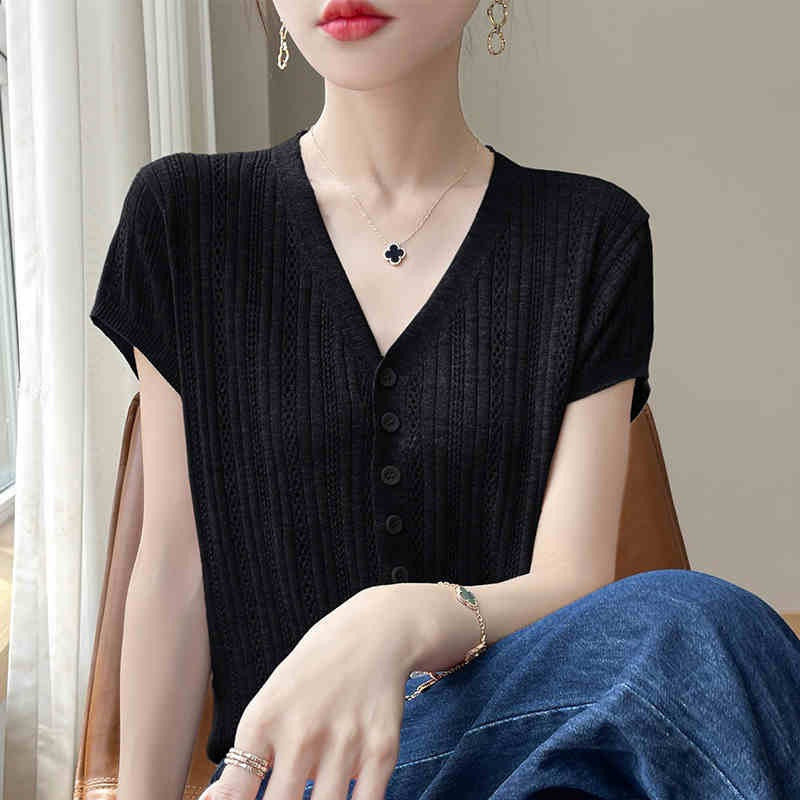 半袖襟ニットカーディガン、夏用薄手中空、見栄えの良い着痩せトップス、おしゃれで万能なカジュアルシャツ