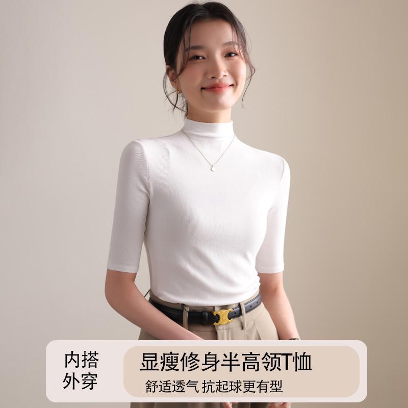 ハーフタートルネックニットミッドスリーブTシャツレディース2025春夏新作スリムフィットホワイトインナーレイヤリングシャツ五分袖トップ