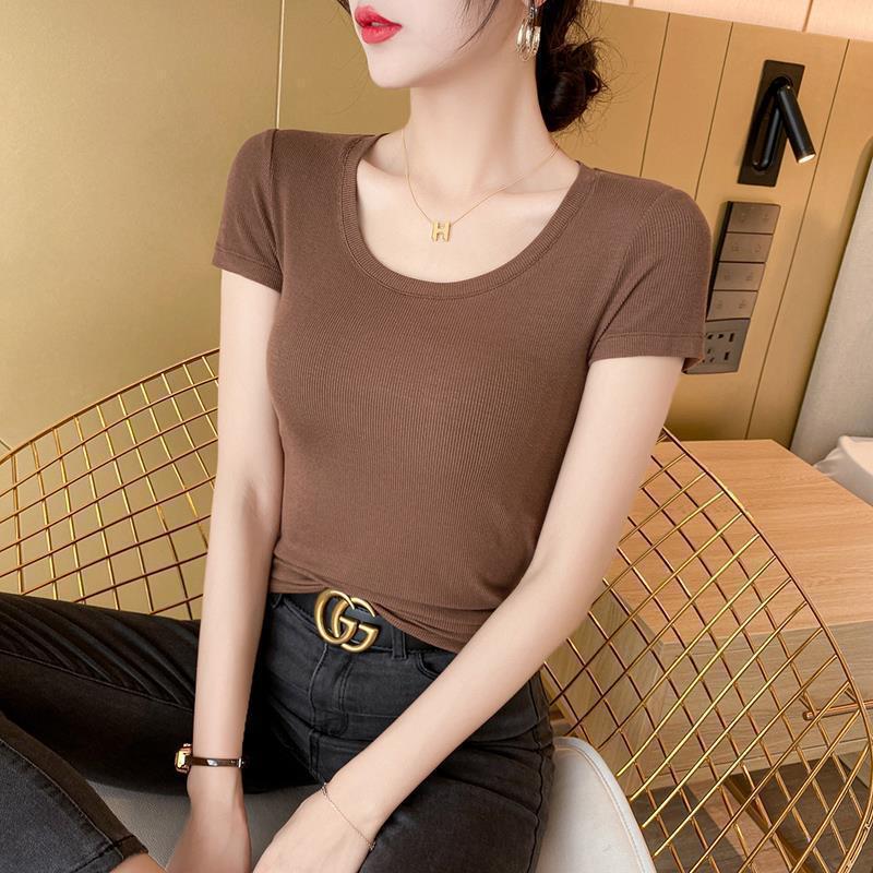 ブラウンラウンドネック半袖Tシャツレディース2025年夏新作ニット糸タイトフィット半袖薄底トップ