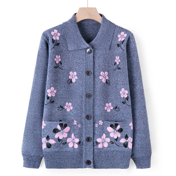 源工場製 中高年向け春秋セーター おばあちゃん風 エレガントなニット刺繍入り ママ服 カーディガン 薄手高齢者用ジャケット