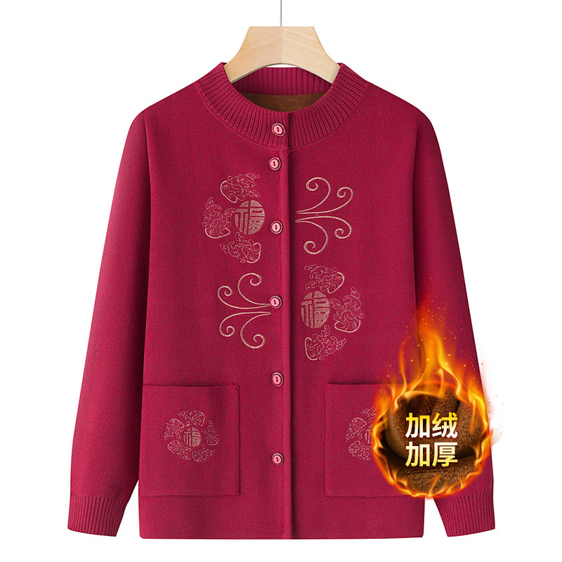 お年寄りのおばあさんのセーターの秋冬のコートのお母さんの服とベルベットの厚いカーディガンの刺繍のおばあさんの服の唐の服の女性