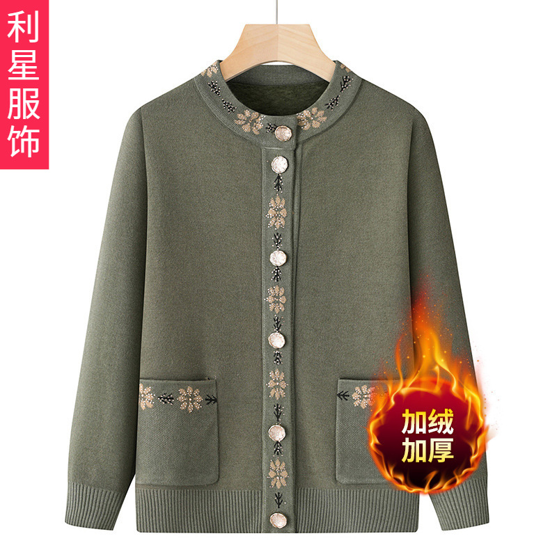 中高年向けセーター、春と秋のゆったりとした刺繍ニットカーディガン、おばあちゃんのアウタートップス、ママのラウンドネックセータージャケット