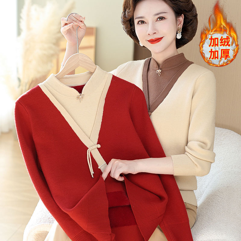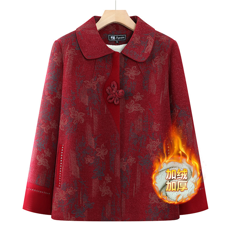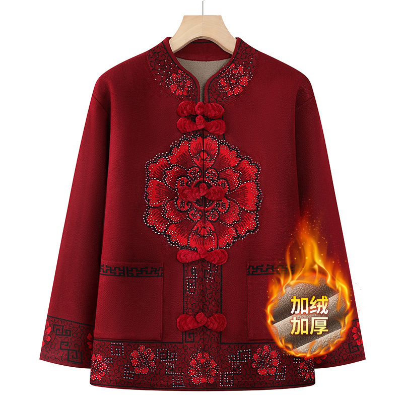 中高年の婦人服秋冬にベルベットを厚くしたベルベットニットのチャイナドレスの襟の上着のお母さんは保温毛服を着ている