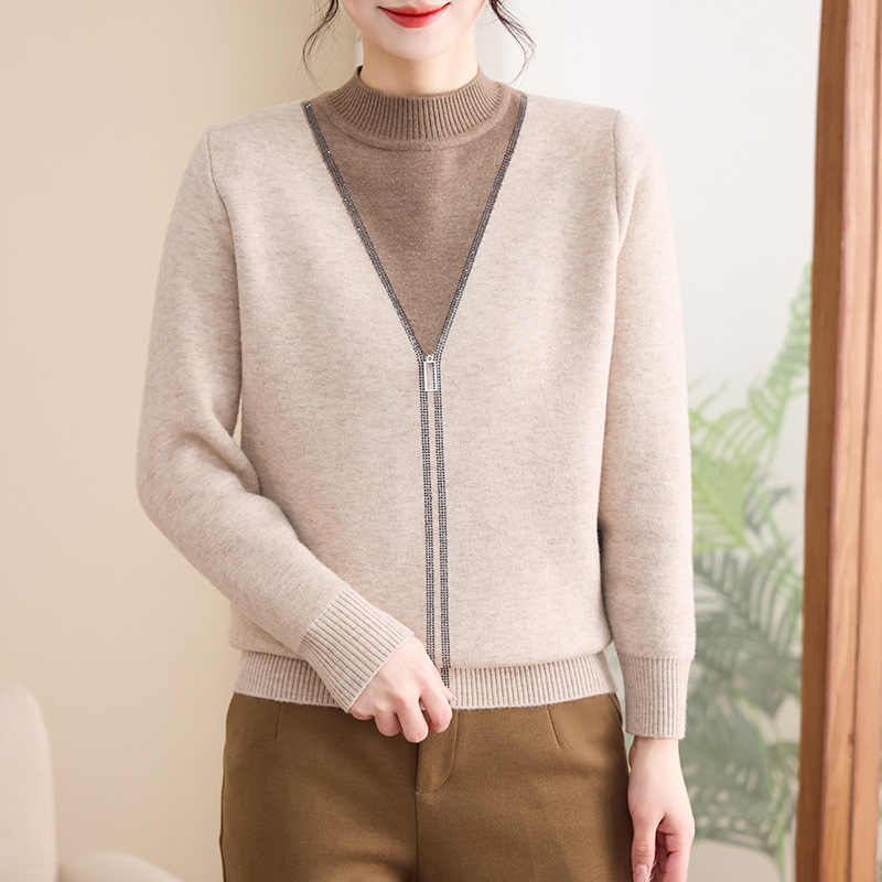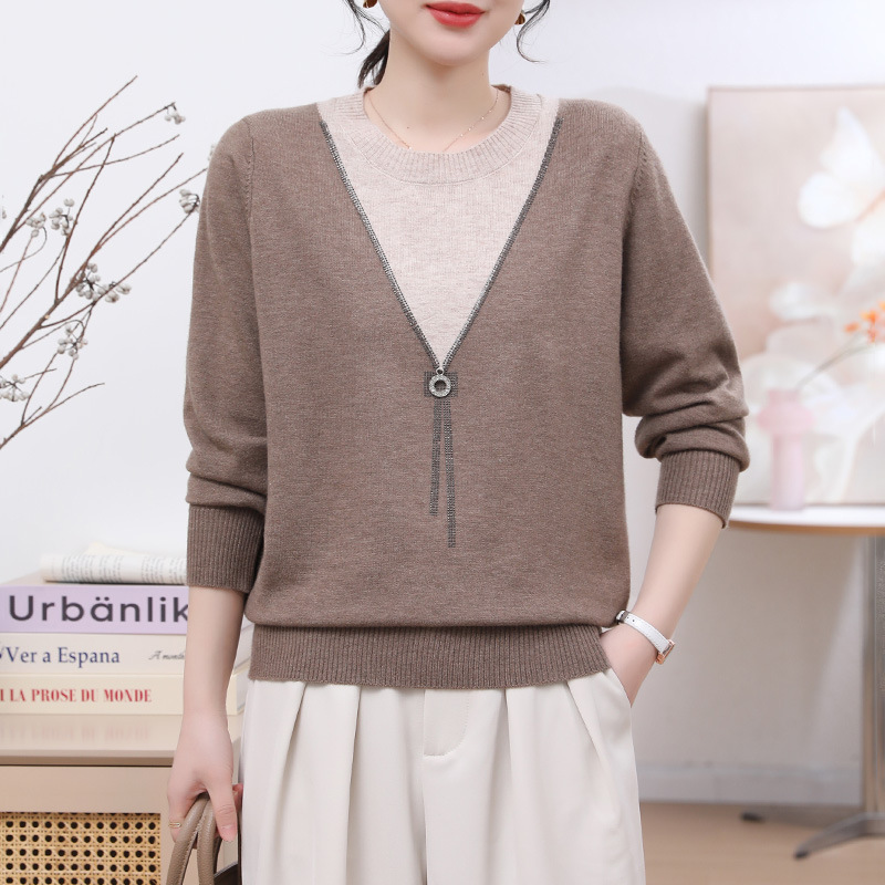 お母さんのファッションの偽の2つの丸首のニットは底の小さいシャツの中で老年の女性の春秋の年齢を減らします。