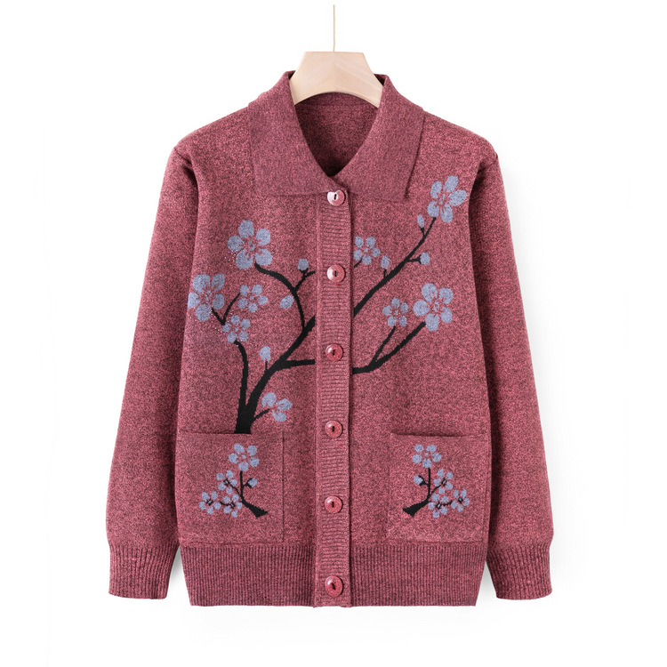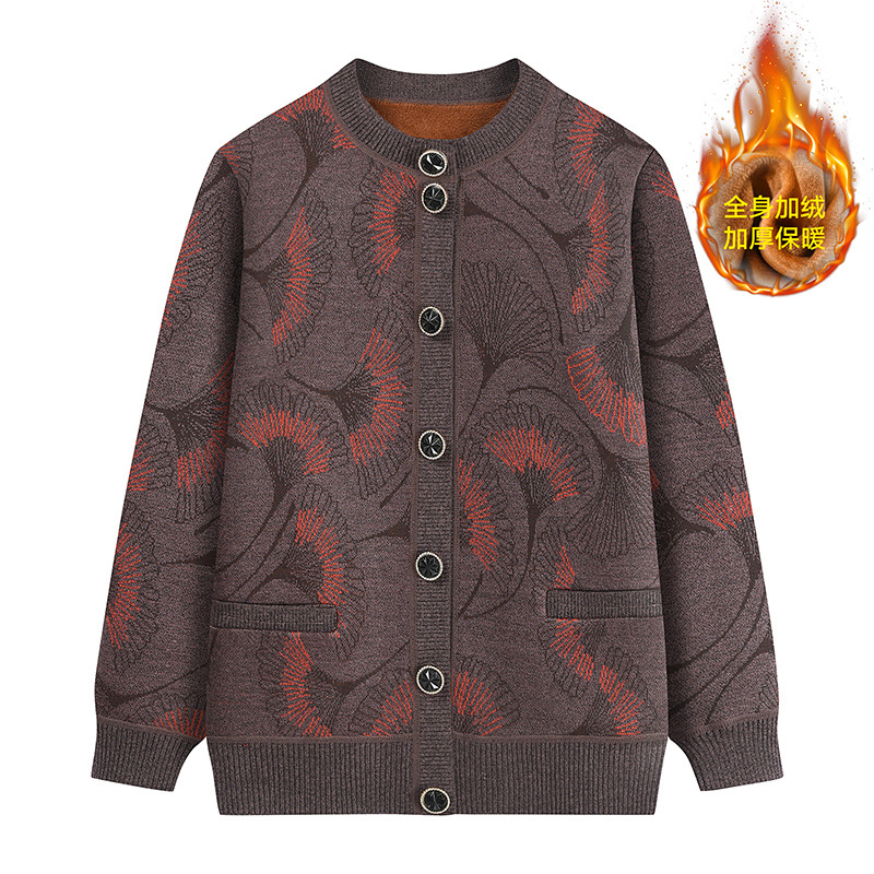 中高年のベルベットの厚いセーターの女性秋冬のおばあちゃんのニットカーディガンの保温プリントのカジュアルなお母さんのコート