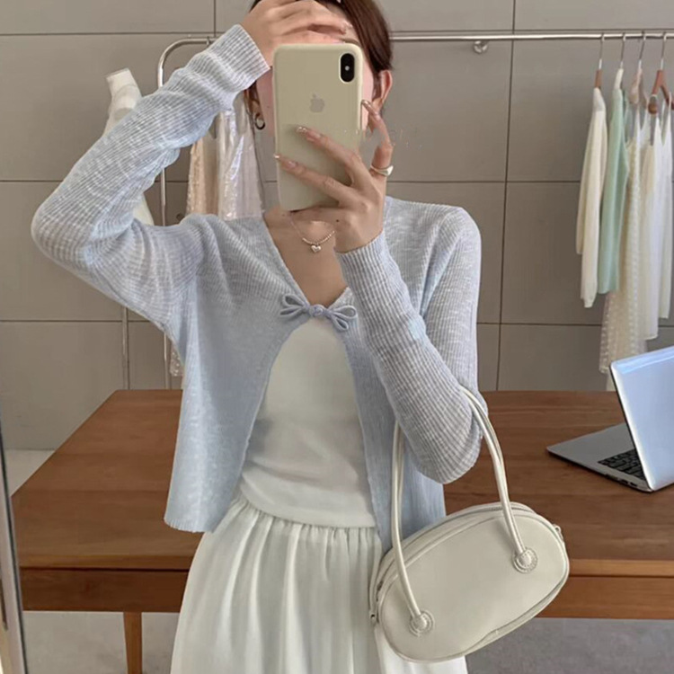 新中国式のバックルvネックの薄いニットの春夏の新型の短いタイプの外は日焼け止めのストールの上着の女性を掛けます。