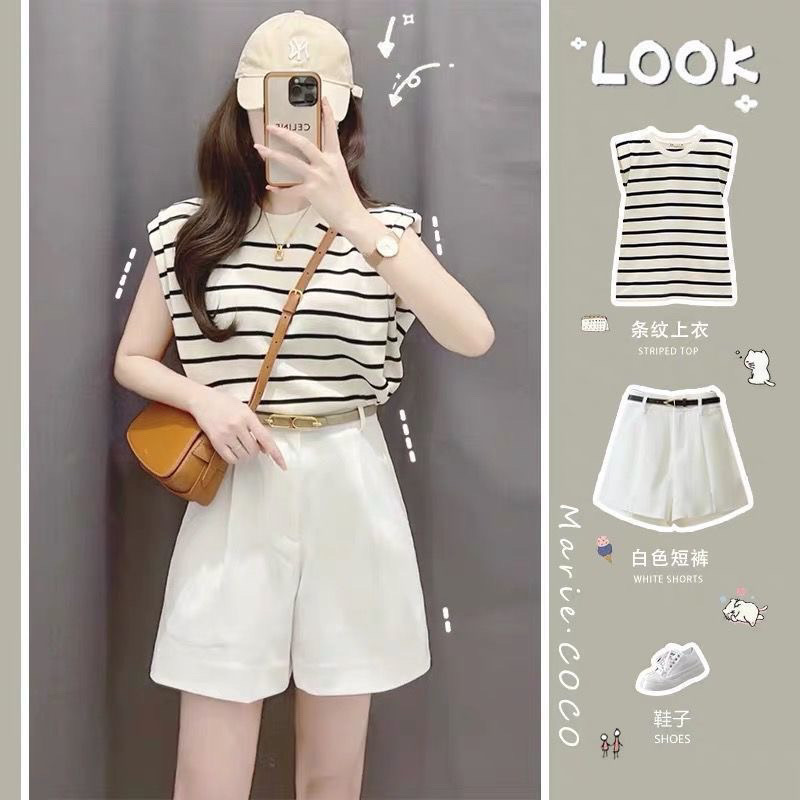 夏のレディース新作ティースタイルコーデセット、年齢軽減ソルトストライプトップスとショートパンツのツーピーススーツ