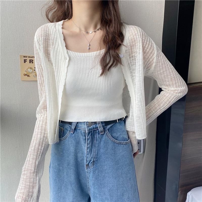 アイスシルク日焼け止めカーディガン女性の薄いショール夏サスペンダースカートとチュールブラウストップシフォンベスト