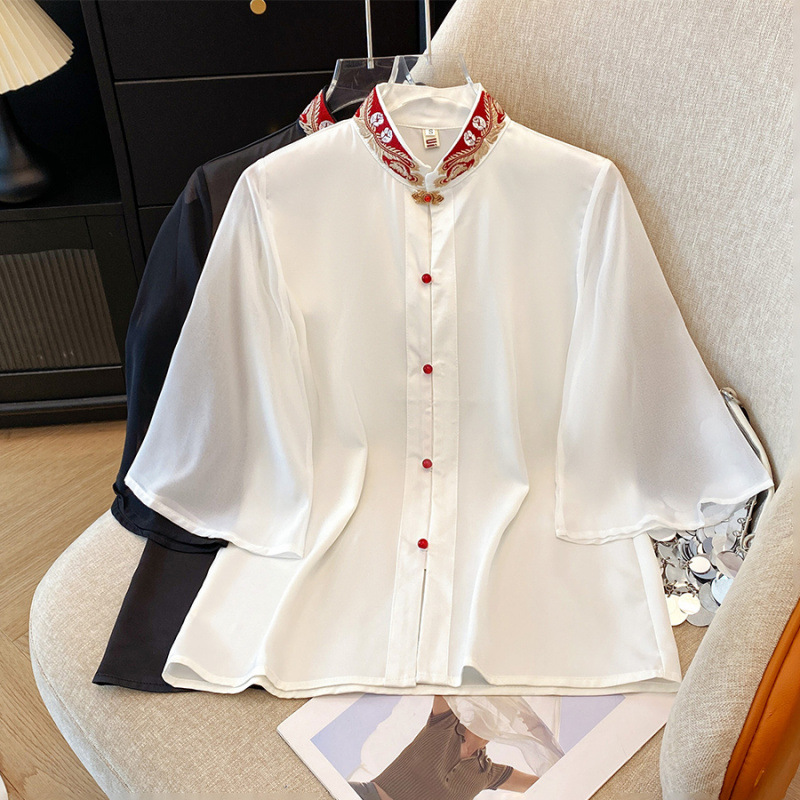 2025夏の新型改良レトロ新中国風立襟蓮の葉の袖に刺繍を合わせてゆったりとした着痩せ上着を見せます。