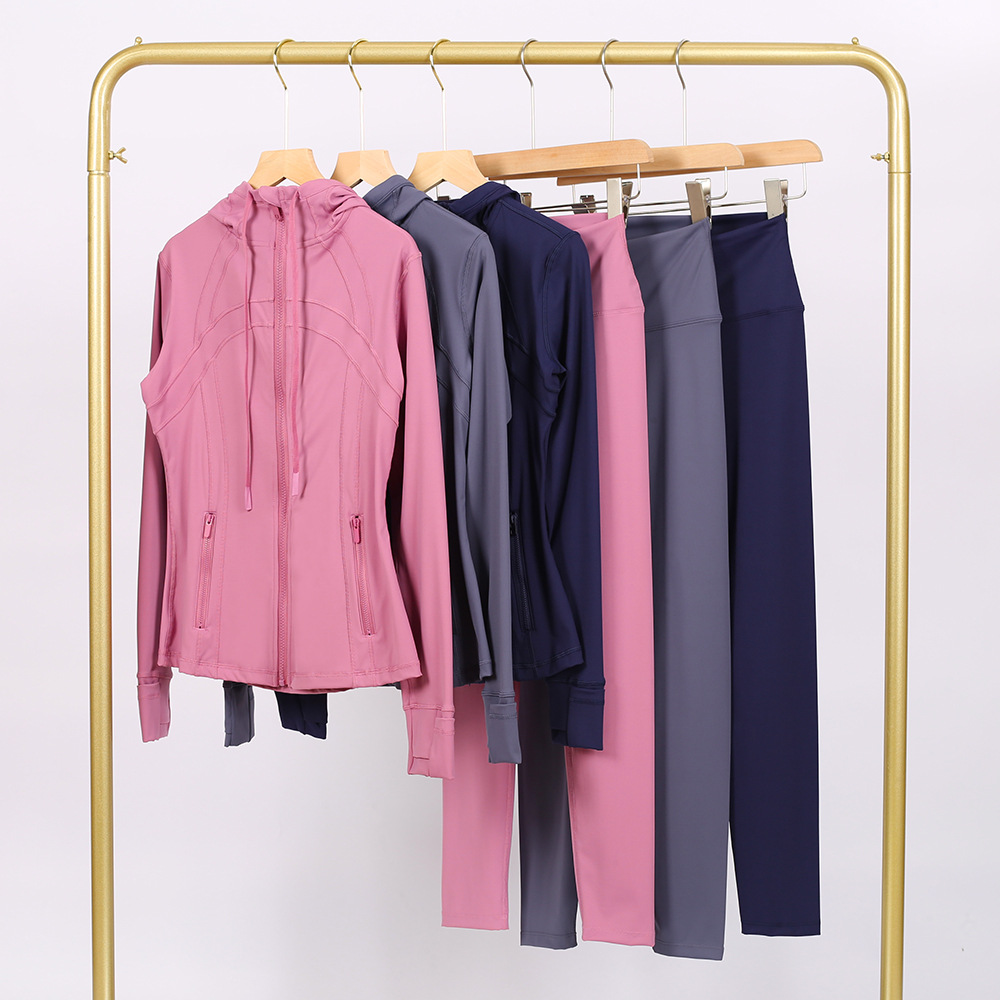 LULU現物フード付きジャケット9分ズボンセットランニングヨガ服コート運動修身ファスナーカーディガン