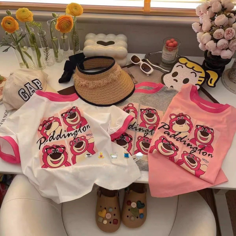女の子の純綿の夏のtシャツの新型の子供の赤ちゃんの夏服は丸首の韓国版のかわいいプリントの上着の綿のtをつづり合わせます。
