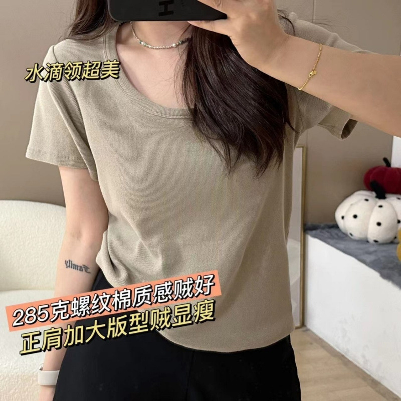 ウォータードロップ U ネック半袖夏無地高弾性スレッドトップ女性のための大きいサイズ右肩カバー痩身多用途 Tシャツ女性のための