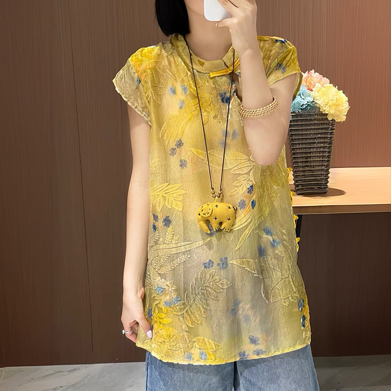 薄いシースルーシルクベルベットバーニングフラワートップ婦人服ドロップシッピング夏半袖新しい中国風ミッドレングスTシャツ