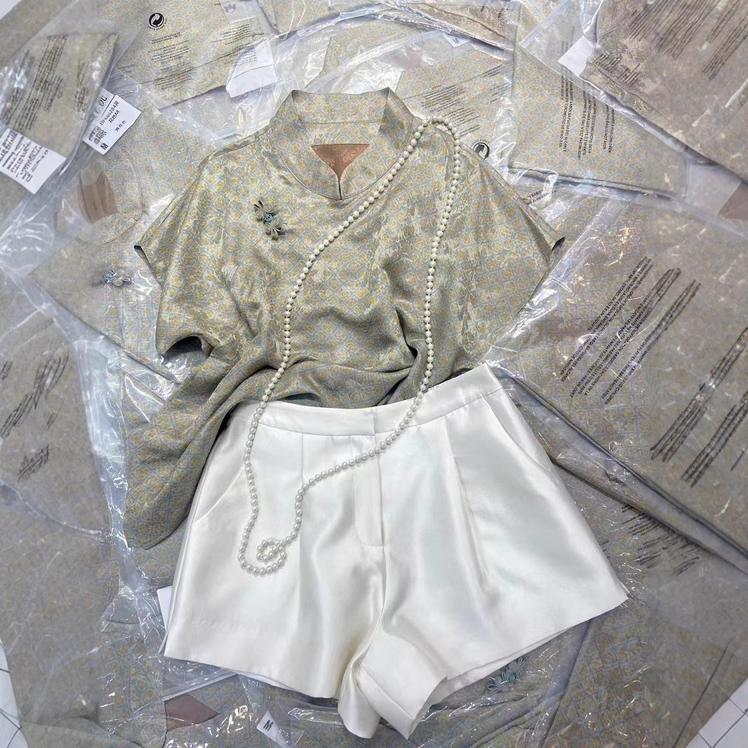 二色新中国式棋盤格シルクジャカード立襟半袖快適百合気質tシャツシャツ夏
