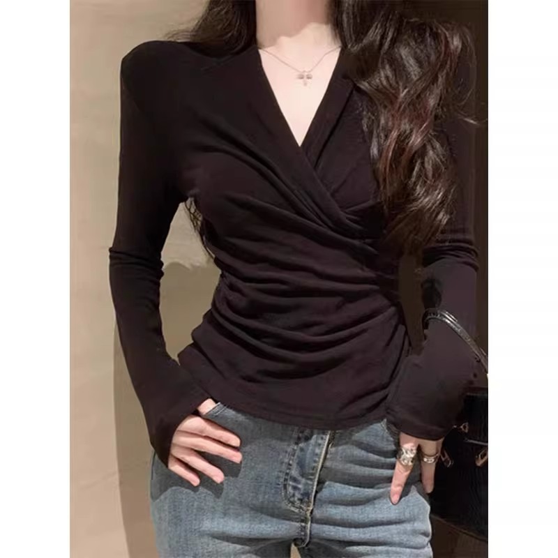 黒いvネックのクロスボディシャツの女性の秋冬感の中で身を修めて腰のギャルのタイトな長袖のtシャツの上着を収めます。