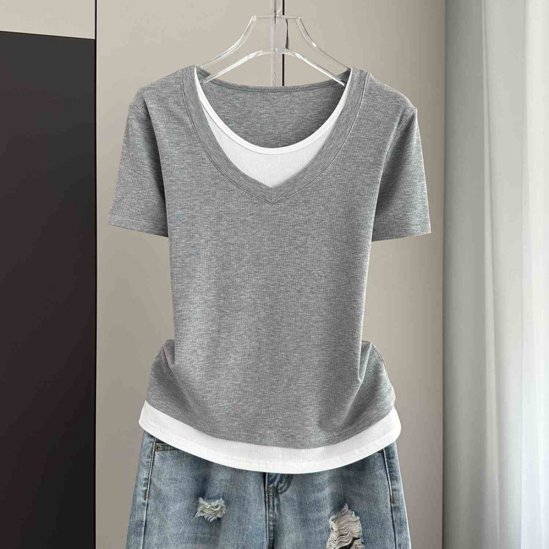 偽ツーピースコントラストカラー V ネック半袖 Tシャツ女性のための 2025 夏の新しい韓国シックなルーズショルダー Tシャツトップ